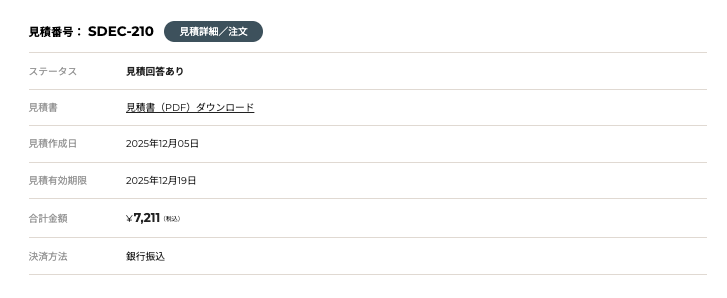 ・マイページ内「見積履歴」内にてステータスが「見積回答あり」となり、PDFで見積をダウンロードいただけます。